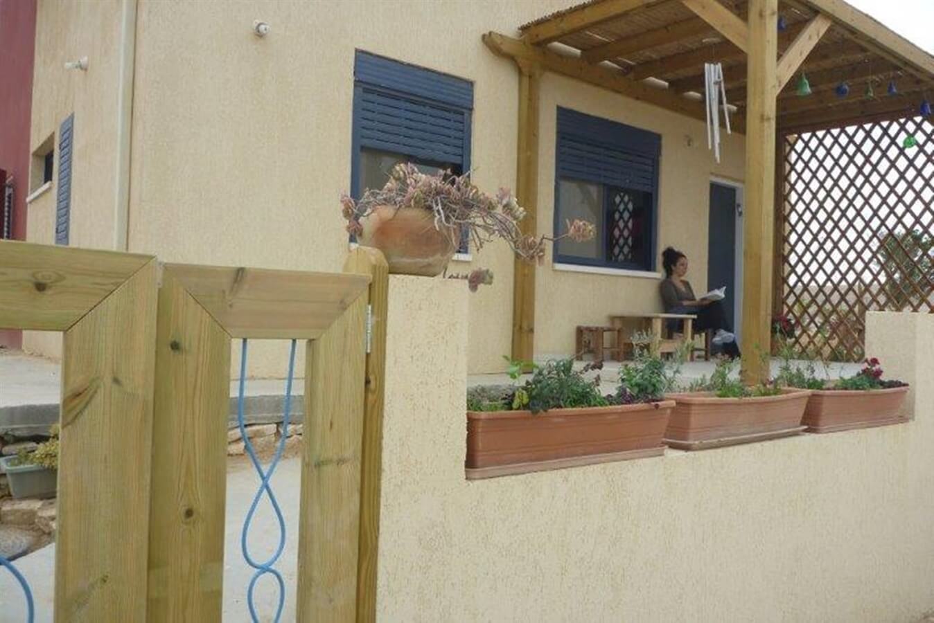 מהצימר יציאה למרפסת כפרית הממלאת בשלווה מדברית עם ערסל, מנגל, פינת ישיבה וצמחיה- פינת קפה